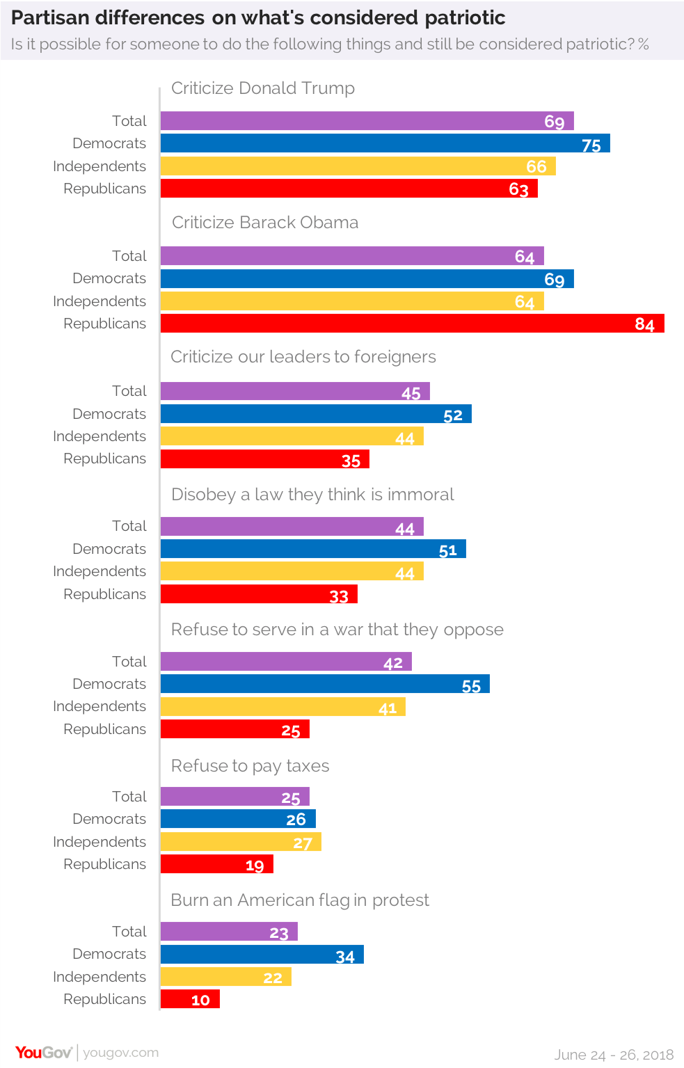A June 2018 YouGov poll clearly illustrates how differently members of the political parties view patriotism.