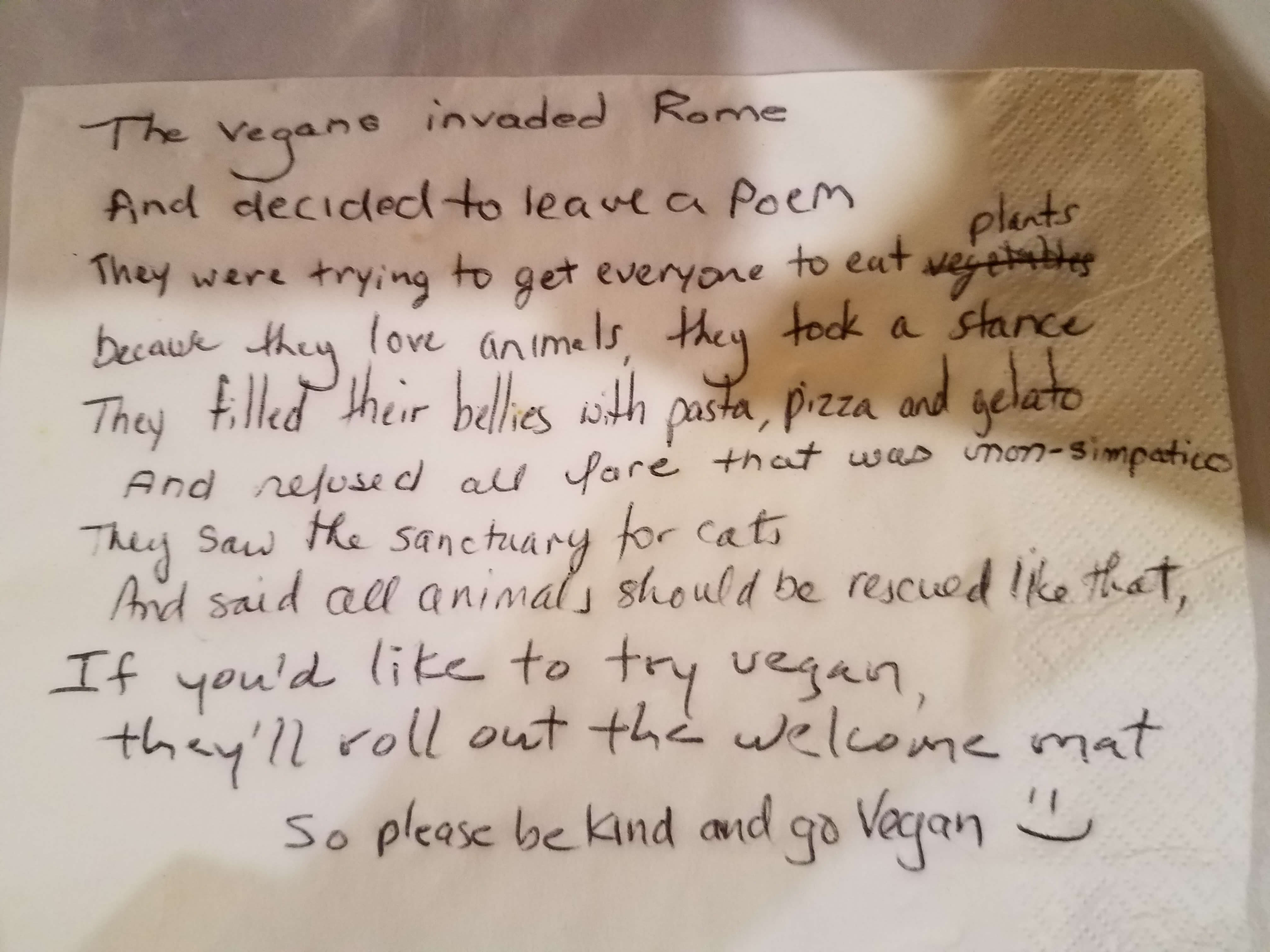 On his board, we were delighted that he had several pro-vegan messages. So we asked him to pen an English poem to honor our vegan tour group. Thanks, Pasquino!