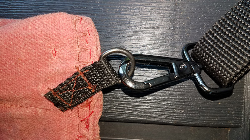 Then, also on the back canvas, sew D-ring loops on each end on the top. These should be placed 1″ from the sides, 1″ from the top, angled toward the top corners.